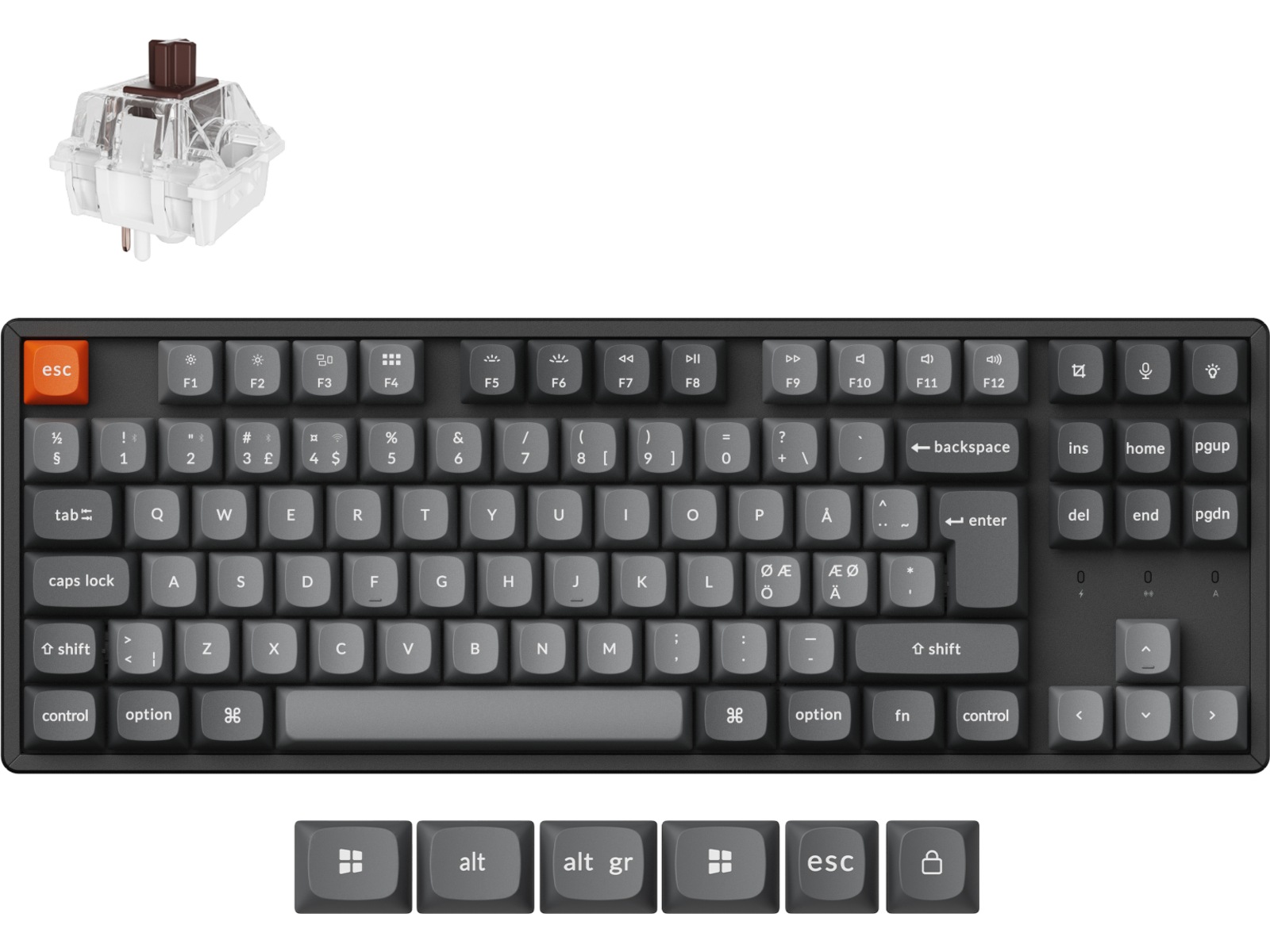 Derudover kan du konfigurere forskellige keymaps til både Mac- og Windows-enheder med Keychron Launcher-webappen. Tastaturet inkluderer tastaturkapper til både macOS og Windows, sammen med ekstra esc- og enter-taster, hvilket letter den sømløse skift mellem operativsystemer.