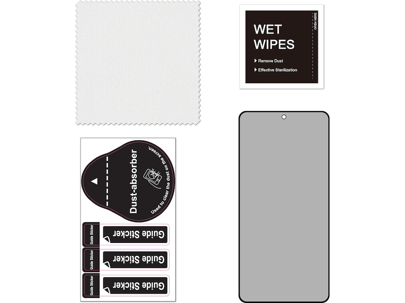 Pakkeindhold Guidemærkater, Støvabsorberer, Skærmbeskytter, Pudseklud, Våde renseklude