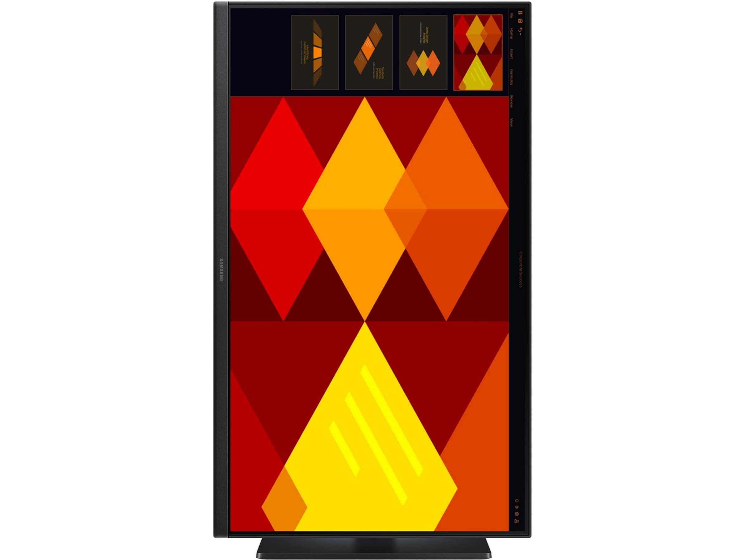 • Et superslankt design giver stil til ethvert miljø, med en højdejusterbar skærm, der giver dig den bedste vinkel og mere alsidighed. De ultratynde rammer udnytter skærmens plads optimalt, og du kan endda dreje skærmen 90 grader for at få en lodret visning.
