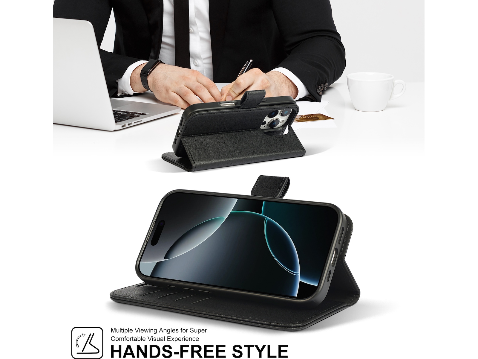 Coveret er meget let og giver god holdekomfort, når du bruger din smartphone. Fronten kan foldes til et stativ, så du kan se film eller deltage i videomøder i en perfekt vinkel! Coveret har en lomme til tre kort.