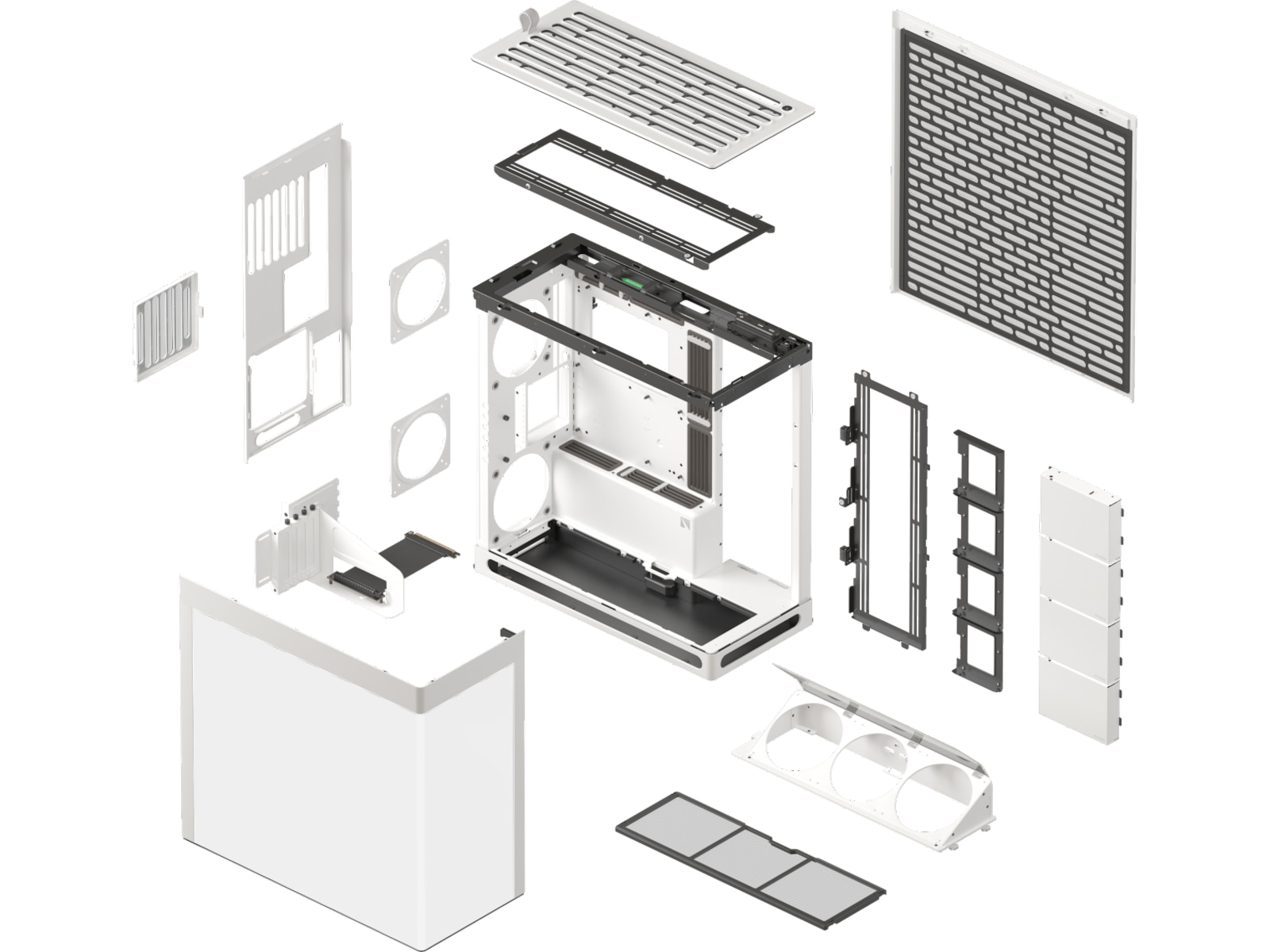 • Forbedret termisk ydeevne med tilpasset ventilation, der understøtter op til 11 x 140 mm blæsere og 420 mm radiatorer ovenpå og på siden.