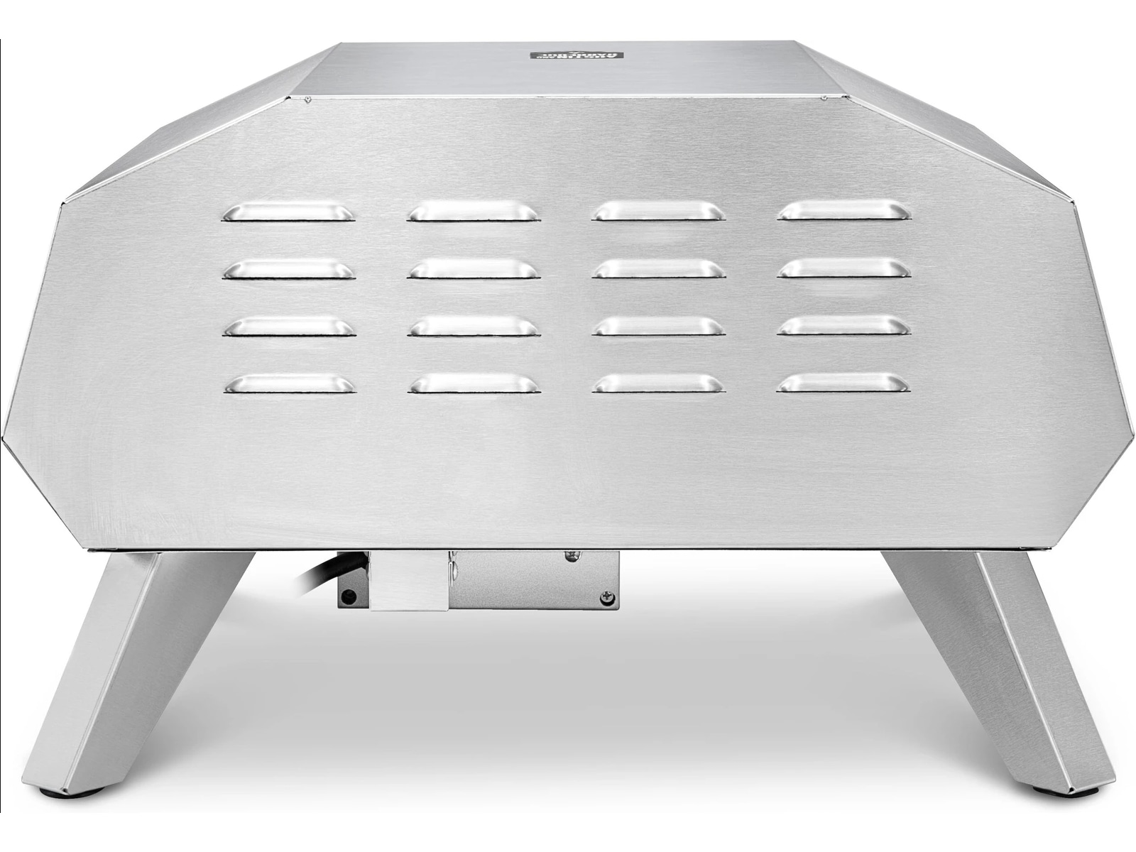 Pizzaovnen er lavet af rustfrit stål og har et komfortabelt håndtag. Rustfrit stål er et holdbart materiale, der holder længe og kan tåle høje temperaturer uden at miste sin oprindelige form. Rustfrit stål er også let at holde rent!