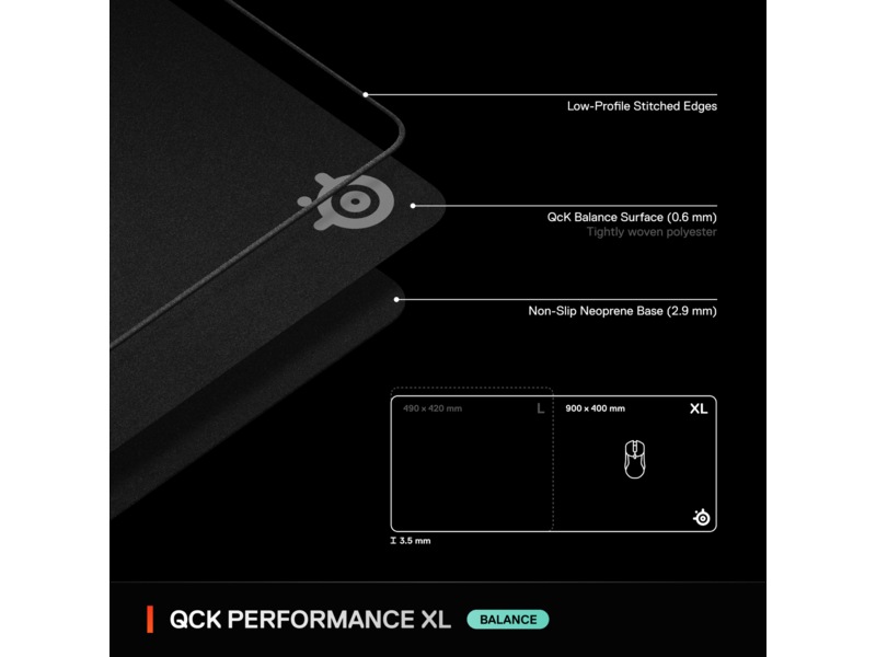 Med en ideel tykkelse på 3,5 mm er QcK Balance premium-fremstillet. Højkvalitets neopren-skum skaber en stabil base til din mus, mens lavprofilerede stitched kanter forbedrer holdbarheden og forhindrer, at kanterne flosser. Bygget på årtier af esports-dominans og udviklet i samarbejde med top spillere, er dette en banebrydende gaming musemåtte designet til sejr. Vælg mellem to størrelser, XL (900 mm x 400 mm) for at omfatte din spillestation i stilrent sort, eller L (490 mm x 420 mm), som kun er reserveret til din mus.