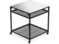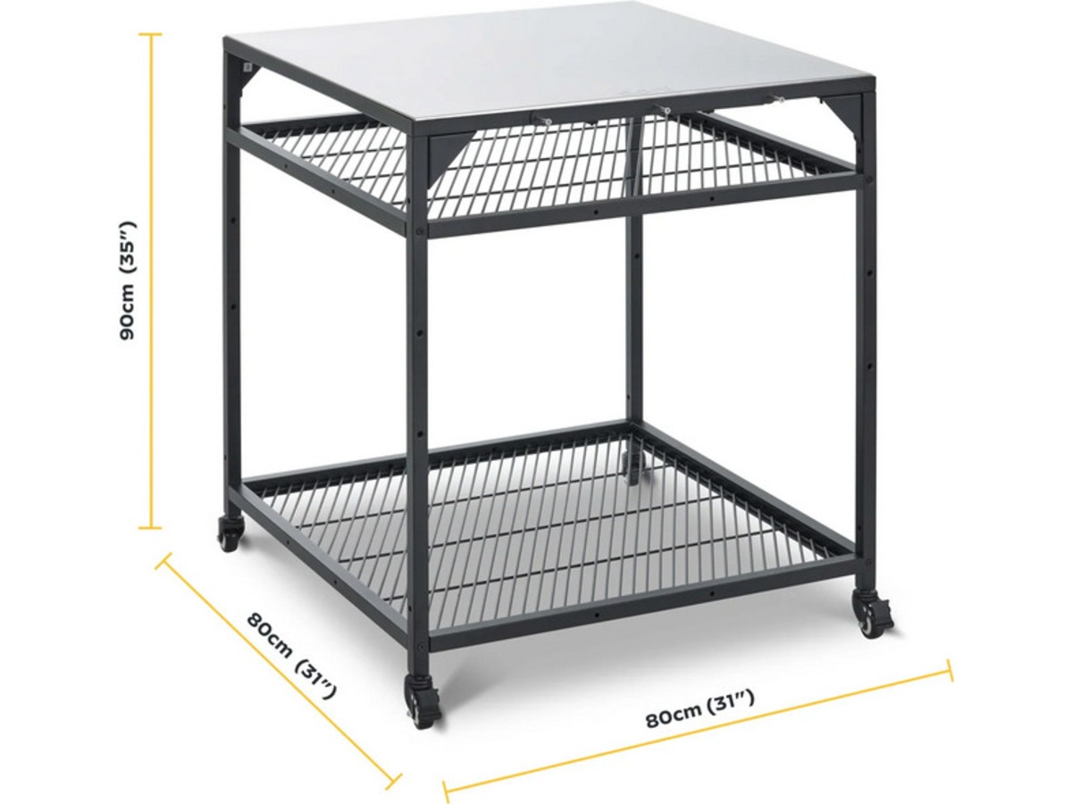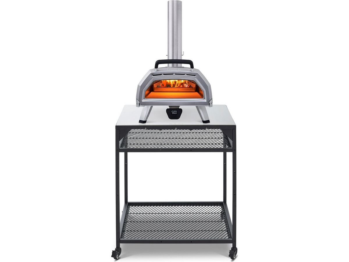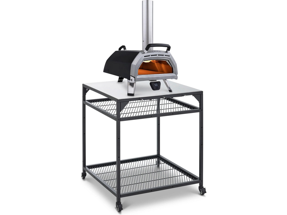 Vore borde er lavet af robust pulverlakeret kulstofstål. De har også to højdejusterbare hylder og indbyggede kroge til dine Ooni-skuffer og tilbehør. Desuden vil de to låsbare hjul holde dit bord stabilt, mens du laver mad.