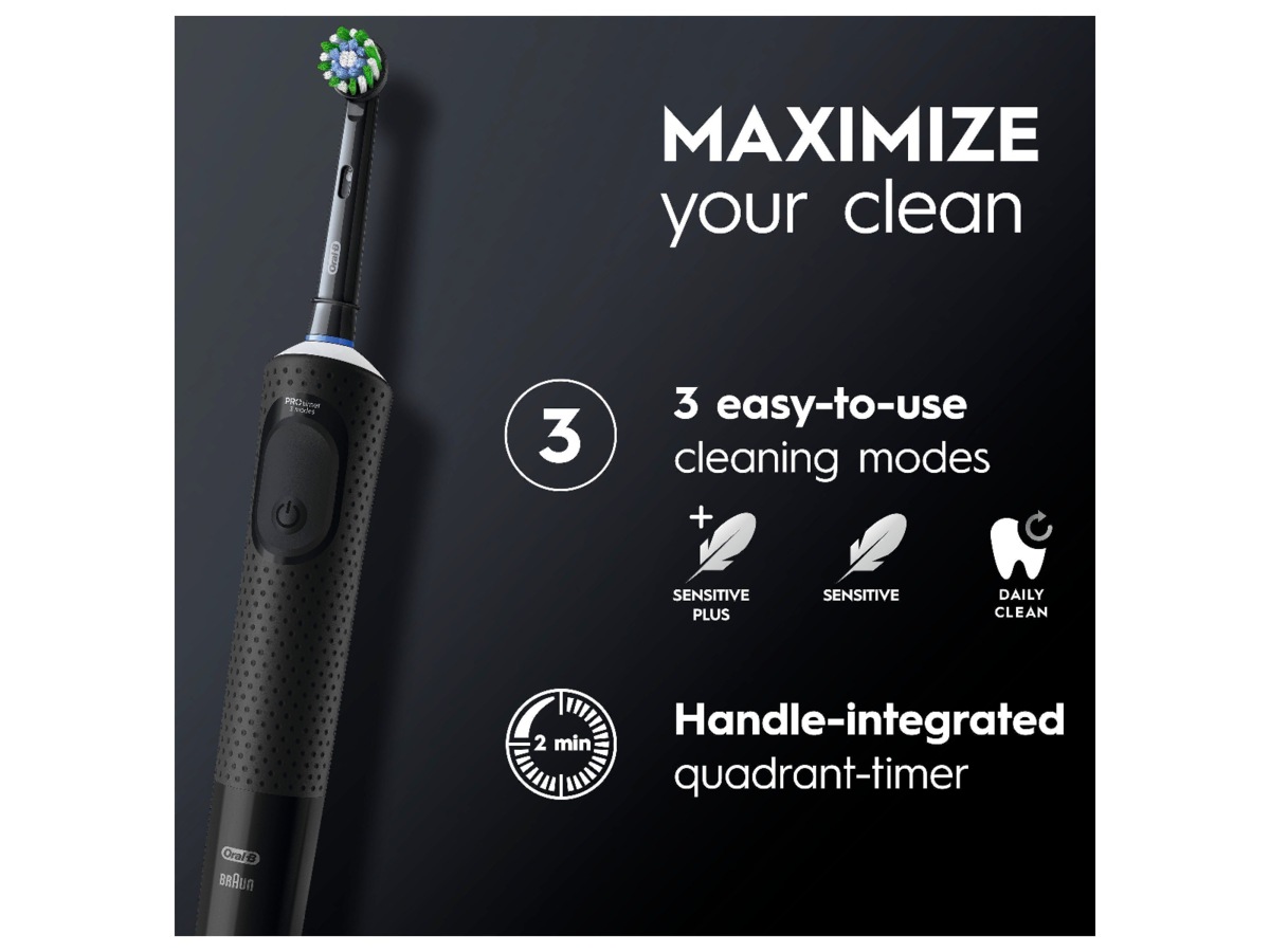 Det er klinisk bevist, at den genopladelige tandbørste Oral-B Vitality Pro rengør overlegent bedre end en almindelig manuel tandbørste. Tandbørsten har 3 indstillinger til børstning: daglig rengøring, sensitiv og sensitiv plus-indstilling for en utrolig skånsom oplevelse. En timer i håndtaget hjælper dig med at børste i 2 minutter som tandlægen anbefaler. Og det bedste af det hele er, at den leveres af Oral-B – det mærke, som flest tandlæger bruger verden over.