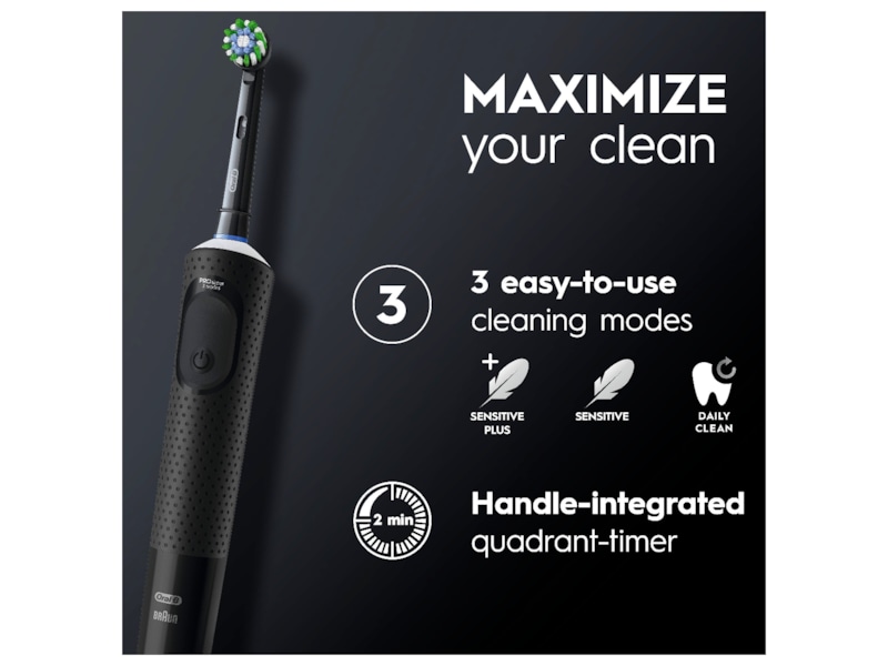 Det er klinisk bevist, at den genopladelige tandbørste Oral-B Vitality Pro rengør overlegent bedre end en almindelig manuel tandbørste. Tandbørsten har 3 indstillinger til børstning: daglig rengøring, sensitiv og sensitiv plus-indstilling for en utrolig skånsom oplevelse. En timer i håndtaget hjælper dig med at børste i 2 minutter som tandlægen anbefaler. Og det bedste af det hele er, at den leveres af Oral-B – det mærke, som flest tandlæger bruger verden over.