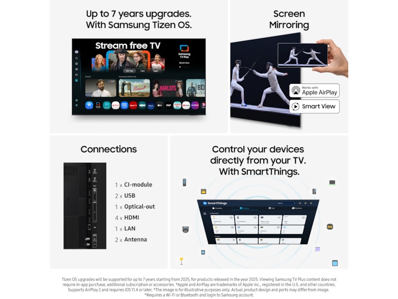 Egenskaber Samsung Daily+, Smartphone fjernstyret, Mini Map Zoom, Gesture Control, Smark kalibrering, Samsung Vision AI, Samsung Knox Security, Workout Tracker, Generativ baggrund, 7 års Tizen OS-opgraderinger, Super Ultra Wide Game View, Apple AirPlay support, Hue Sync, Spilbarre, Wireless TV On, Daglig bestyrelse, SlimFit Cam support, FreeSync Premium Pro, Karaoke-mikrofon, Embeded POP
