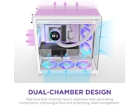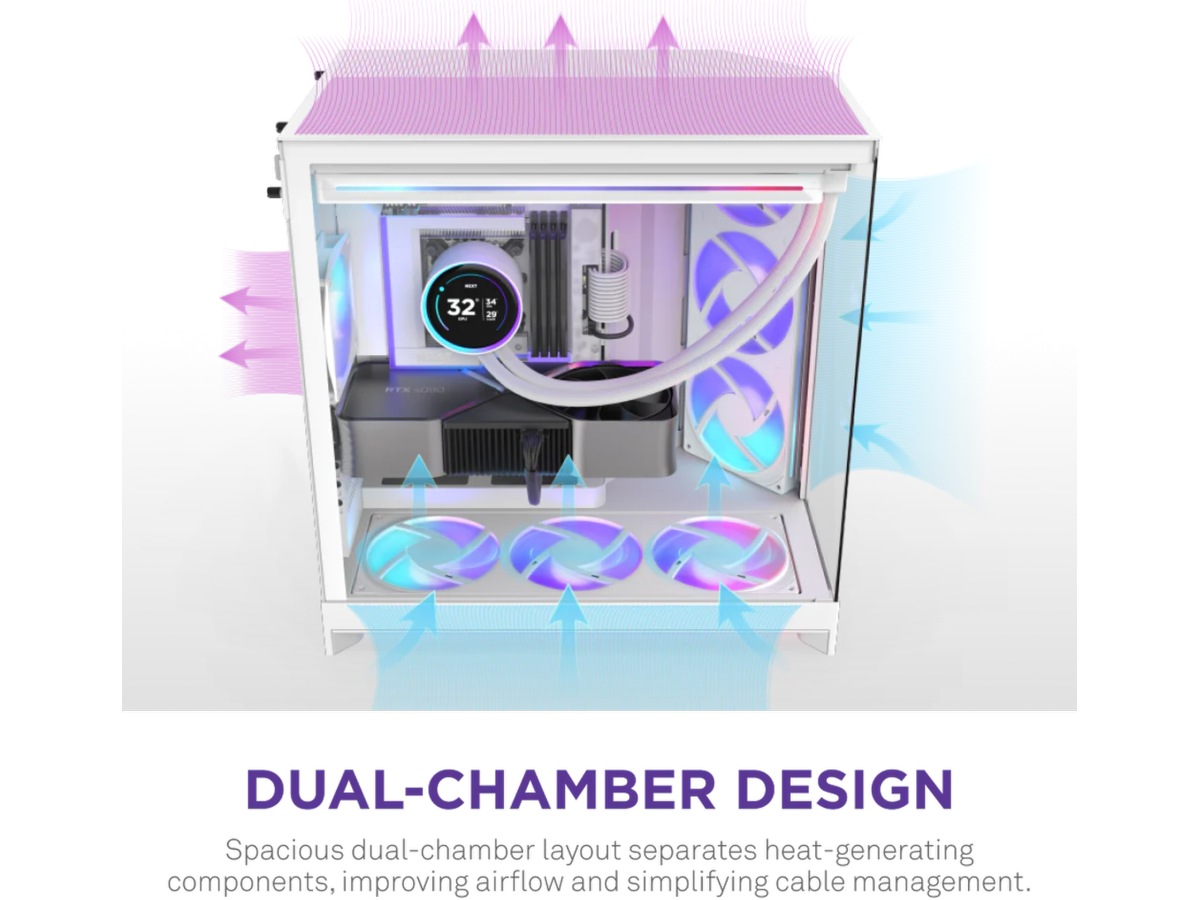 - Dobbeltkammerdesign: Adskiller hovedkomponenterne fra PSU og drev for forbedret termisk ydeevne og kabelstyring.