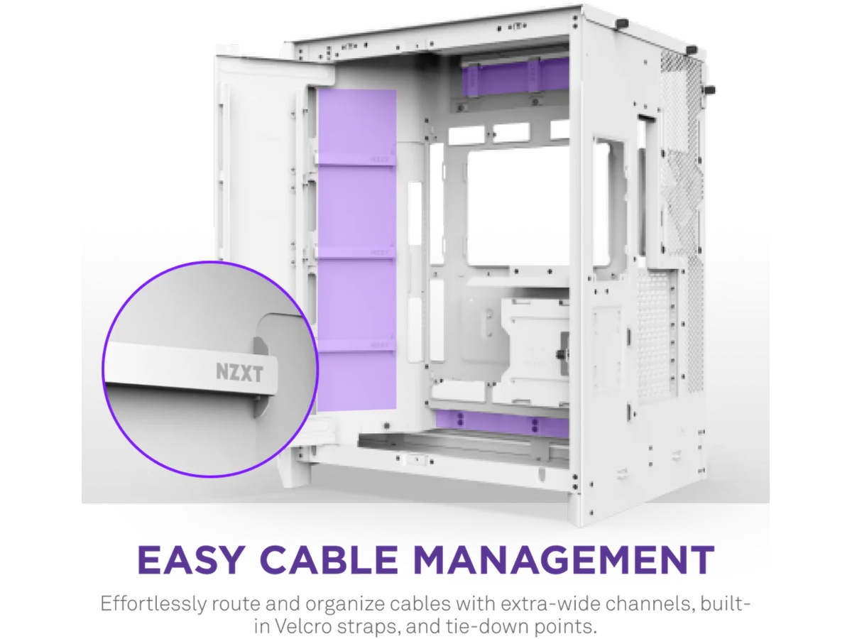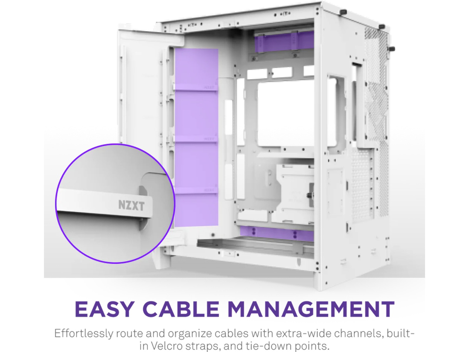 Ekstra brede kanaler, Velcro stropper, og fastgørelsespunkter gør kabelstyring enkel.