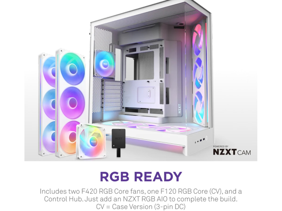 - RGB Klar: Inkluderer to F420 RGB Core enkelt-ramme ventilatorer, én F120 RGB Core (CV) ventilator bagtil, og en NZXT kontrolhub. CV = Kabinetversion (3-pin DC)
