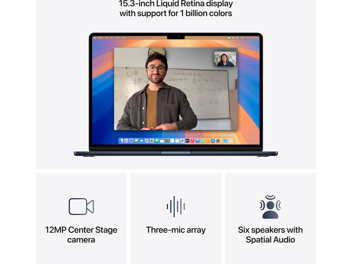 • ANSLUT ALT – MacBook Air har to Thunderbolt 4-porte, en MagSafe-opladerport, et hovedtelefonstik, wifi 6E og Bluetooth 5.3.(3) Og den understøtter op til to eksterne skærme.