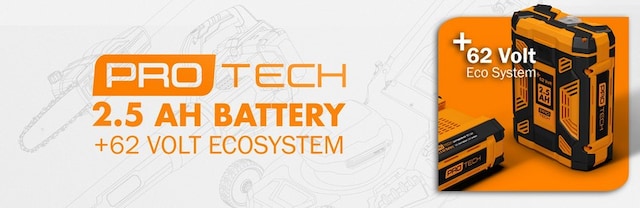 Protech +62 Volt batteriværktøj er en serie produkter, der bruger den samme type batteri. Protech + 62 Volt er et moderne og miljøvenligt batteri-økosystem. Batteriet har en stærk spænding, som gør det muligt for værktøjerne at håndtere de tungeste opgaver i haven.