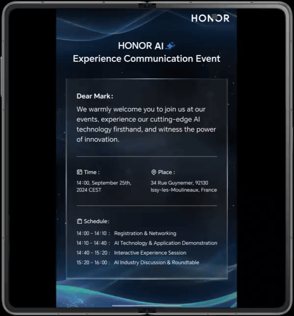 HONOR Face-to-Face Translation understøtter flere inputmetoder, herunder tekst og stemme, og tilbyder oversættelse med lav latenstid. Den indre og ydre skærm arbejder sammen og muliggør samtidig fortolkning.
