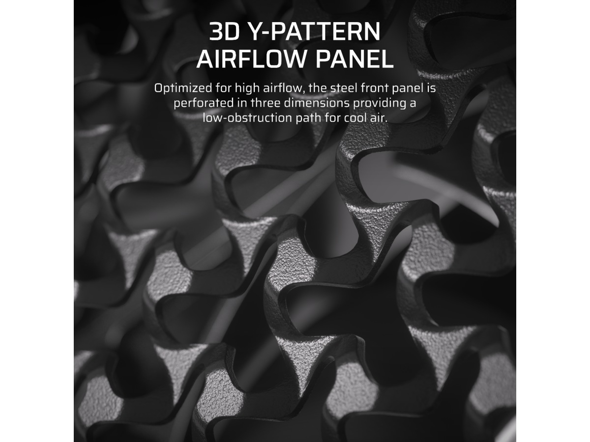 - 3D Y-Mønster Luftstrøm Panel – Optimeret til høj luftstrøm og minimal begrænsning, stålfrontpanelet er perforeret i tre dimensioner med et Y-mønster, der giver en lavobstruktions vej for kølig luft.