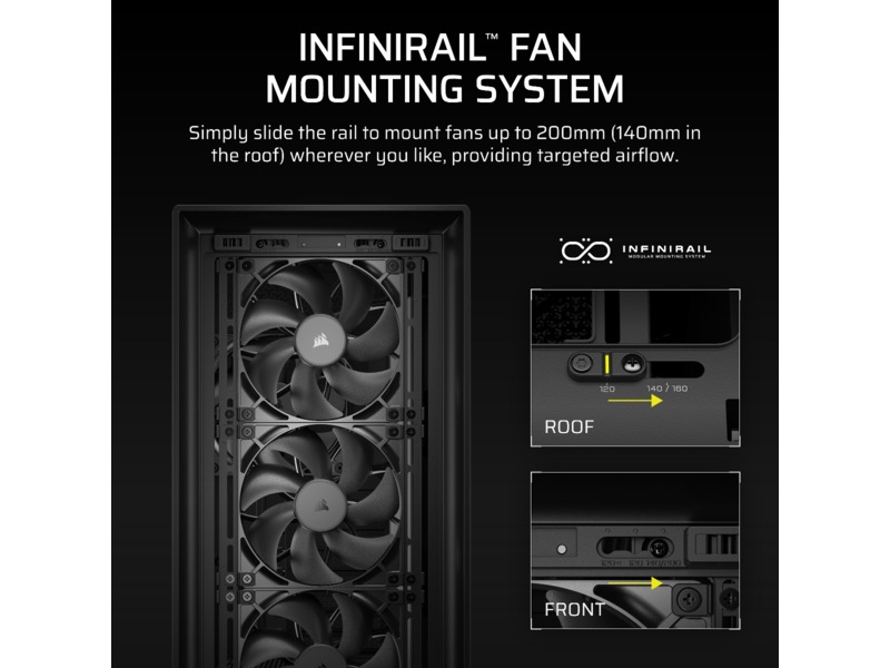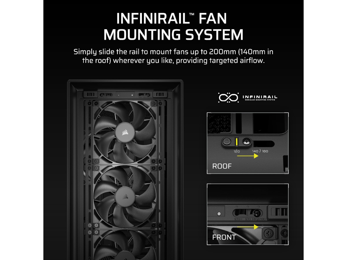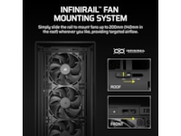 - InfiniRail Ventilator Monteringsmuligheder - Monter op til 14x 120mm ventilatorer samtidig for at holde kold luft i cirkulation og varm luft hurtigt udledt, eller juster nemt InfiniRail™ ventilator monteringer til 140mm eller 200mm ventilator placeringer. Kombinationerne er næsten uendelige.