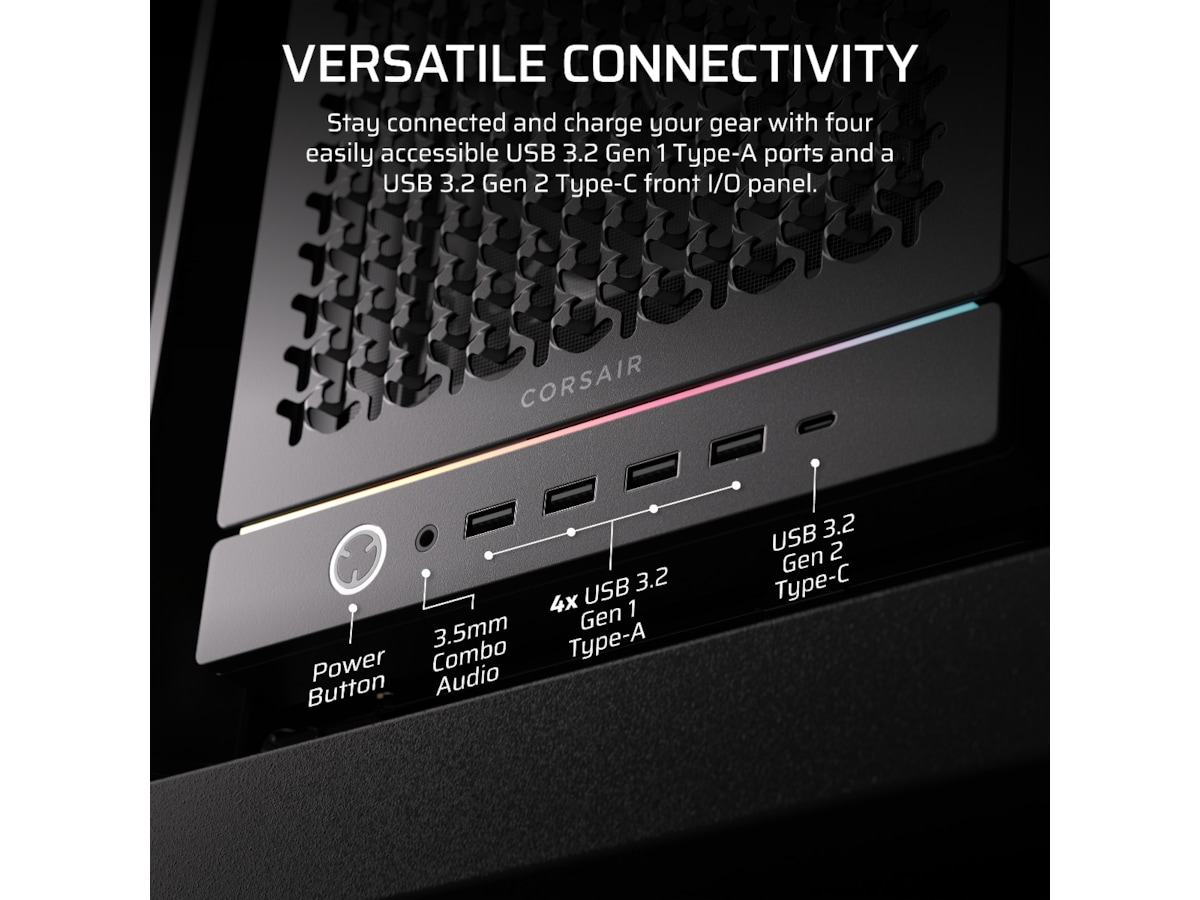 - Alsidig Forbindelse – FRAME 5000D tilbyder fire USB 3.2 Gen 1 Type-A porte og et USB 3.2 Gen 2 Type-C front I/O panel. I/O portene er også blevet flyttet til bunden af kabinettet for at gøre det nemt for folk med deres PC på skrivebordet at tilslutte enheder.