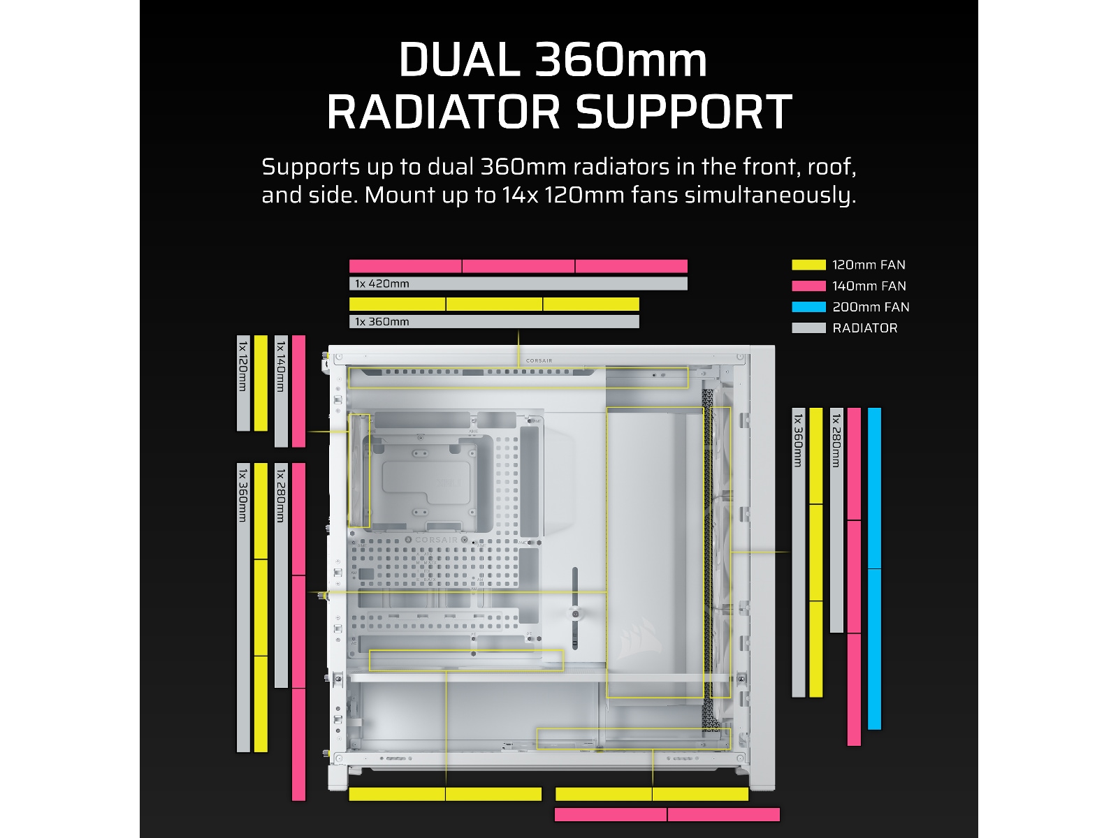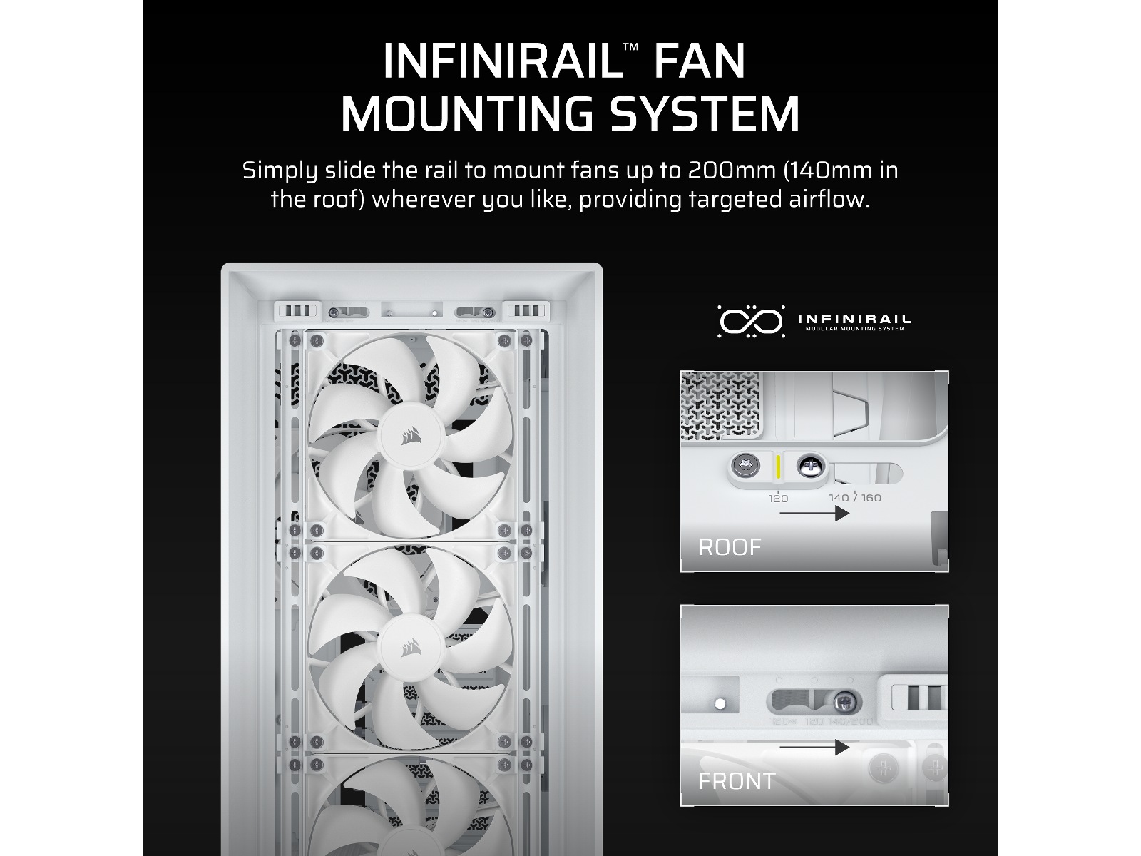 - InfiniRail Ventilator Monteringsmuligheder - Monter op til 14x 120mm ventilatorer samtidig for at holde kold luft i cirkulation og varm luft hurtigt udledt, eller juster nemt InfiniRail™ ventilator monteringer til 140mm eller 200mm ventilator placeringer. Kombinationerne er næsten uendelige.