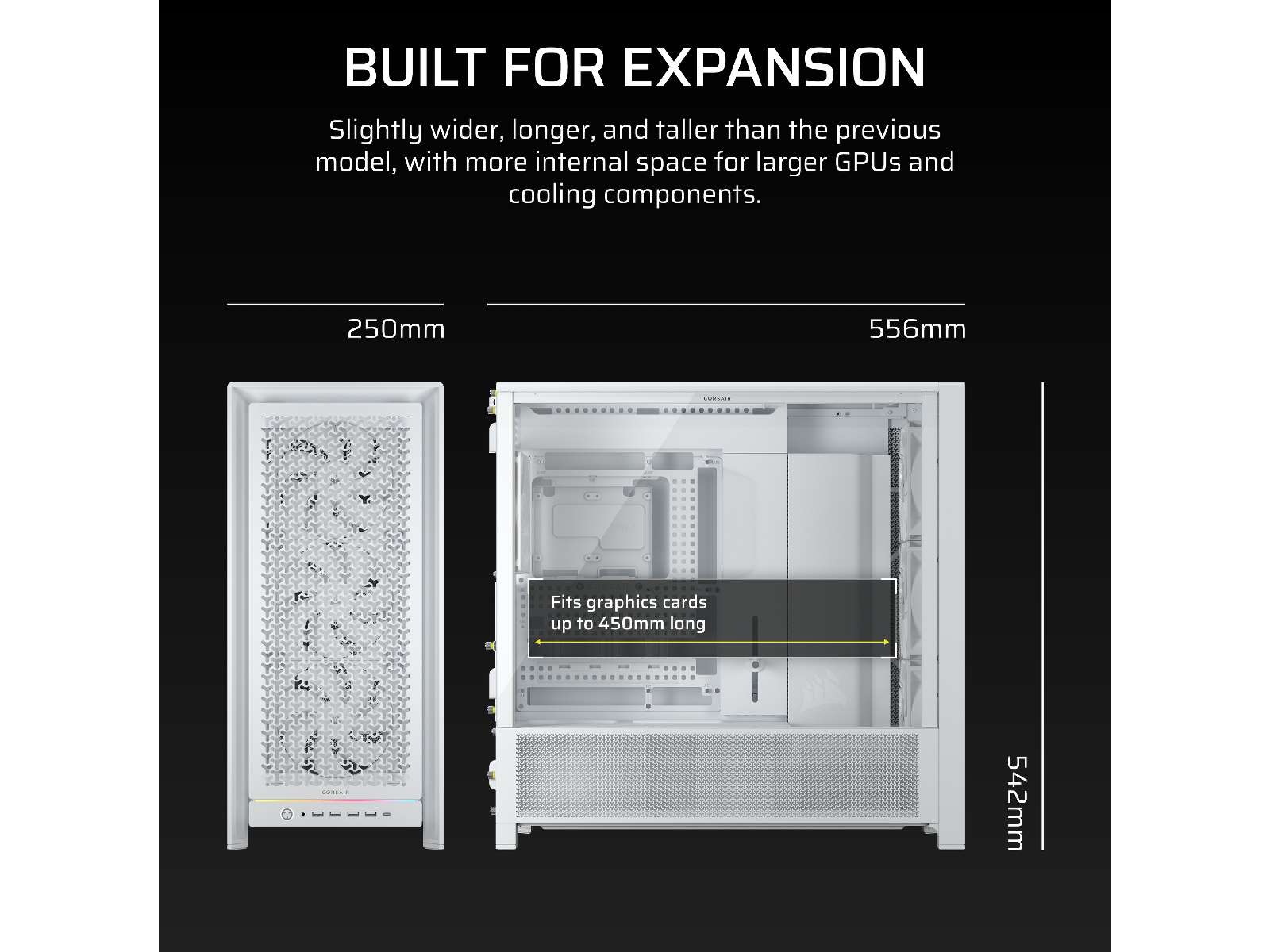 - Elegance Touches – Frame 5000D inkluderer en række funktioner, der viser CORSAIR's opmærksomhed på detaljer. De inkluderer eksterne kabelstyringspunkter, fangskruer, der ikke går tabt, fuldt farveafstemte nitter, skruer og plastik komponenter, en attraktiv Frost White mulighed og indbyggede roterbare PCI slots til vertikale GPU montering fans.