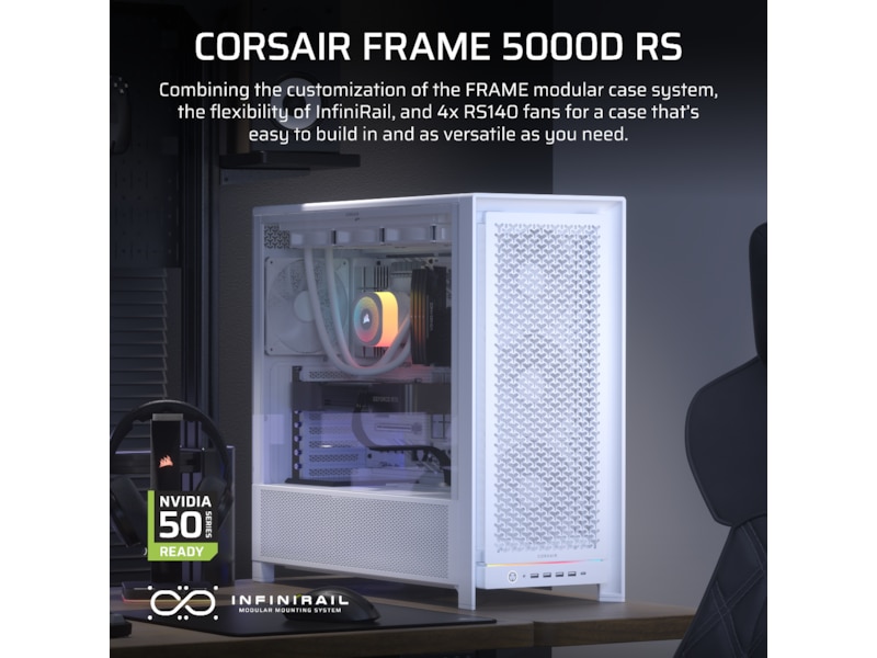 Byg den høj-luftgennemstrømmede, lavtemperatur-PC af dine drømme i CORSAIR FRAME 5000D high-airflow kabinet, der har det innovative FRAME Modular Case System, der tilbyder en hidtil uset fleksibilitet til perfekt at tilpasse dit build, som du ønsker det. InfiniRail Montagesystemet forenkler ventilatorinstallation, mens støtte til op til en 420mm radiator og et nyt 3D Y-Mønster Luftstrøm frontpanel sikrer, at kold luft ledes præcist, hvor det er mest nødvendigt. Den øgede bredde og længde sikrer kompatibilitet med de mest kraftfulde grafikkort og køleoptioner, med understøttelse af omvendt tilknytnings-motherboards fremtidssikrer dit system. Vi leverer rammen. Du skaber kunsten.