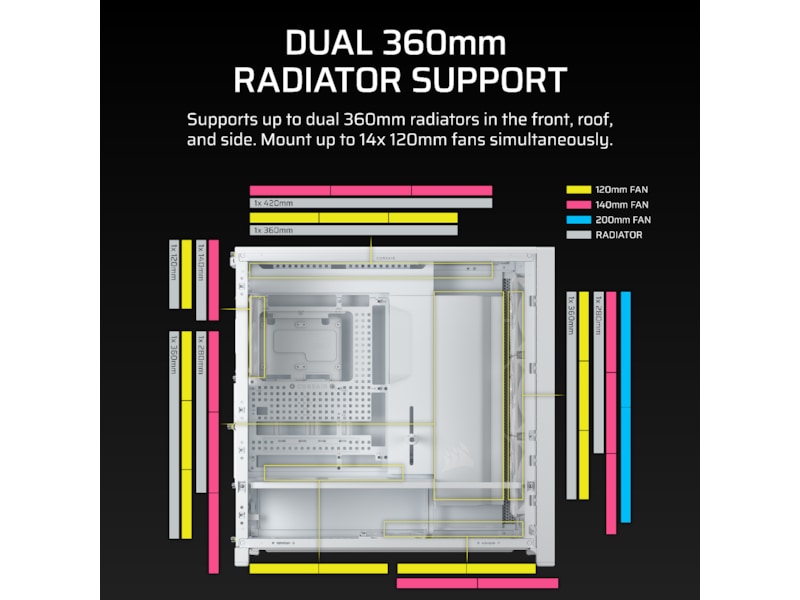 - InfiniRail Ventilator Monteringsmuligheder - Monter op til 14x 120mm ventilatorer samtidig for at holde kold luft i cirkulation og varm luft hurtigt udledt, eller juster nemt InfiniRail™ ventilator monteringer til 140mm eller 200mm ventilator placeringer. Kombinationerne er næsten uendelige.