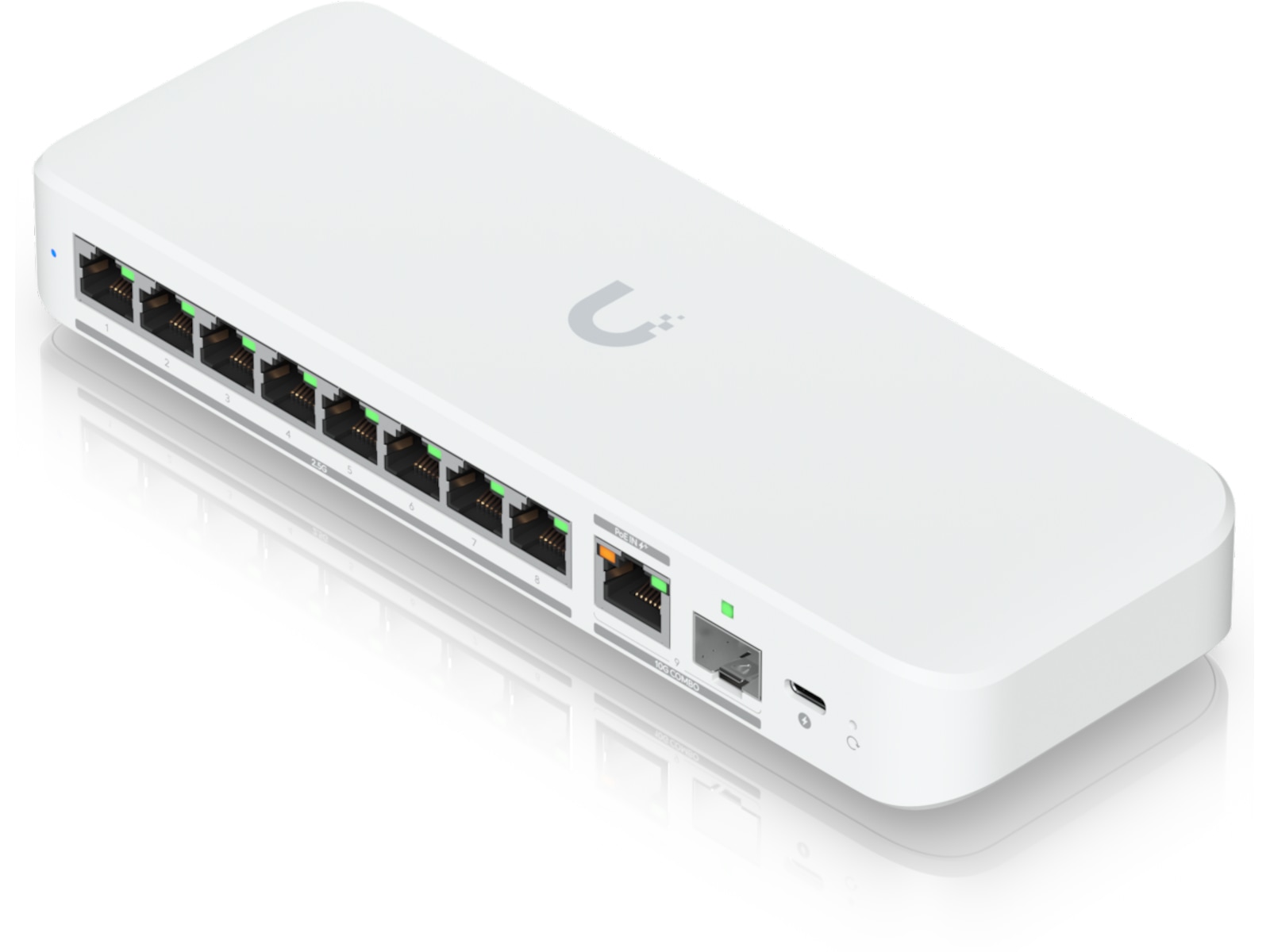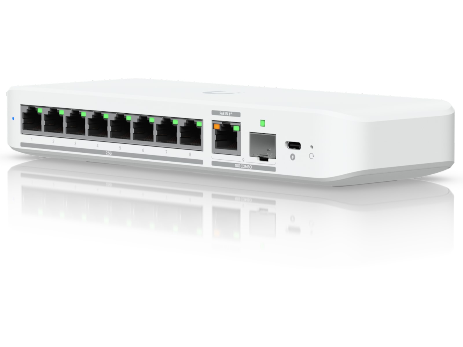 Flexible, 8-port 2.5 GbE switch with a 10 GbE RJ45/SFP+ combination uplink port that can be powered with a USB-C or PoE+ adapter.