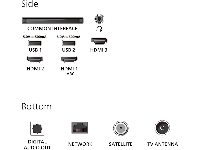 2 x USB - side, 3 x HDMI - side, Audio line-out / hovedtelefoner - side, LAN - nederst, Digital lydudgang (optisk) - nederst