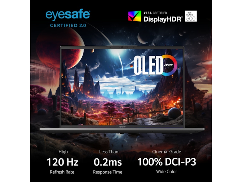 Få Swift Go 16 med en 16:10 ultra-glat 120Hz 3.2K OLED-skærm, der tilbyder levende farver, bemærkelsesværdigt dybe sorte nuancer og ultra-skarp billedkvalitet, eller vælg den intuitive berøringsskærm til ubesværet tryk og swipe