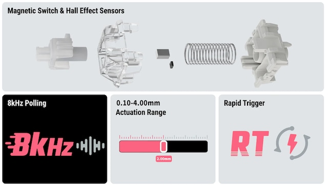 Et gennemsnitligt menneskes reaktionstid er 300-500ms, mens en professionel gamer kan nå 200ms gennem træning. Den samlede rejsetid for et tastetryk til at registrere efter fingerkontakt kan imidlertid let nå >100 ms, hvor meget af tiden bruges på, at tasten falder ned til aktueringspunktet. En magnetisk kontakt halverer denne rejse ved at adskille processen med aktivering, opnået med lysets hastighed gennem Hall-effekten, fra den taktile feedback, som kan tage så lang tid som du vil efterfølgende for at sikre din finger om dens forekomst. Og hvis du er tiltrukket af ekstrem ydeevne, så er den berygtede hurtige trigger-tilstand helt sikkert noget for dig.