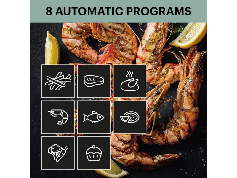 Easy Fry Mega laver mad på blot få minutter og hjælper dig med de fleste hverdagsting som stegning, bagning, opvarmning og gratinering. Med de otte automatiske programmer kan du lave en række forskellige måltider. De automatiske programmer hjælper dig med: pommes frites, nuggets, kylling, pizza, rejer, fisk, grøntsager og bagværk.