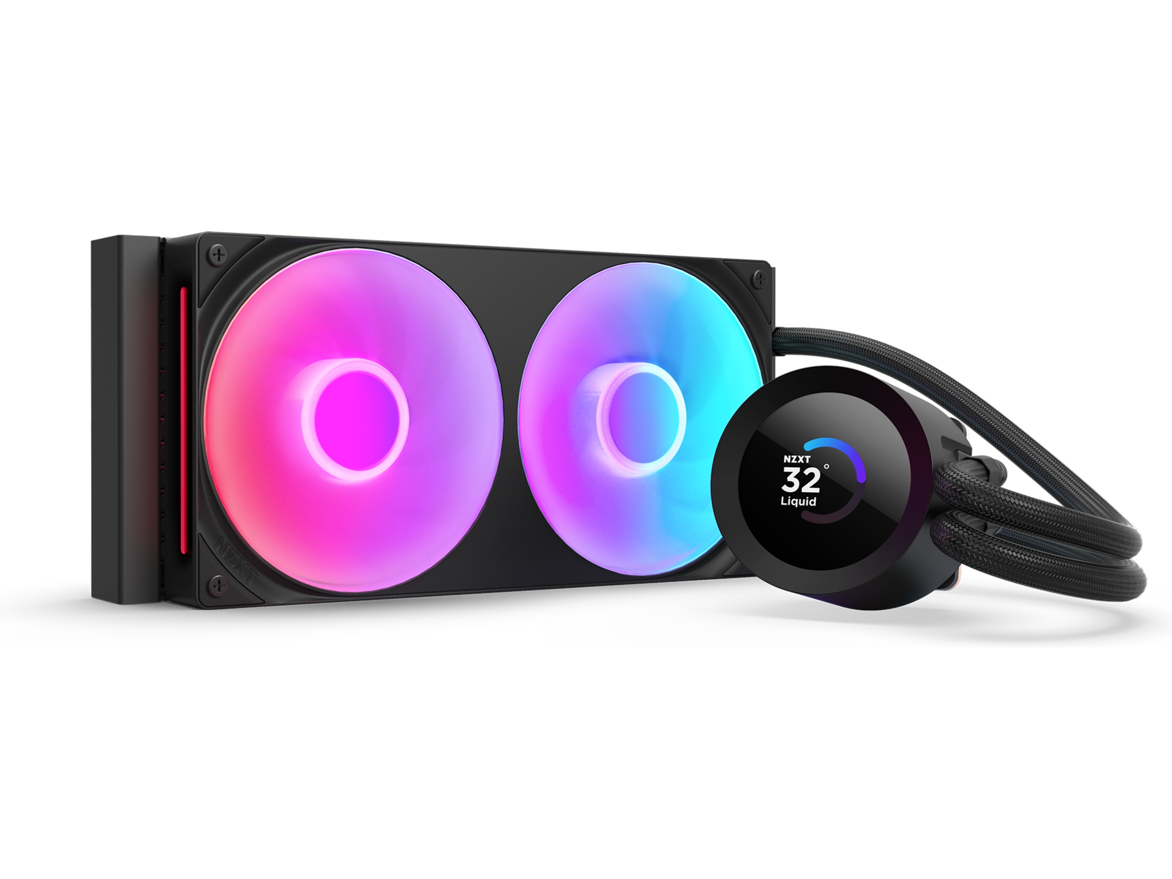 • Brugerdefineret LCD-skærm: Vis realtids systemtemperaturer, animerede GIF'er, brugerdefinerede billeder eller web-integrationer som Spotify og YouTube på en lys 1,54" firkantet LCD — fuldt tilpasset gennem NZXT CAM software.