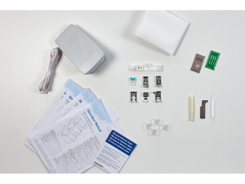 - Trykfødder: zigzagfod, knaphulsfod, knapisyningsfod, overlockfod, lynlåsfod, blindsømfod og monogramsyningsfod