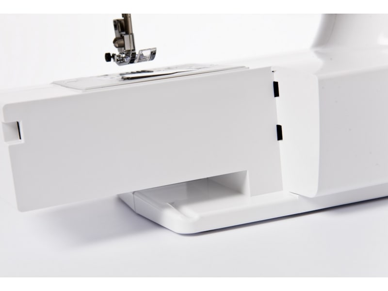 Maskinen er let at tråde med drop-in spolesystemet og har praktisk friarm til at sy i bukseben og ærmer samt LED belysning.