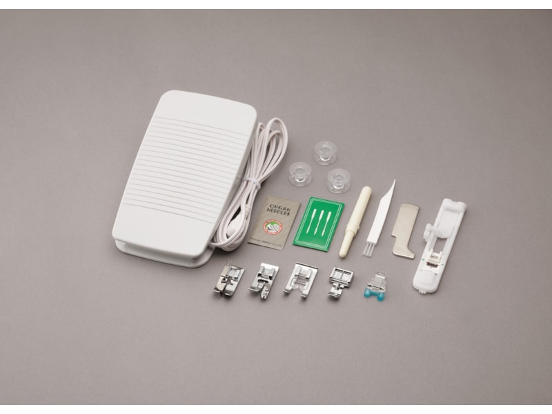 - Trykfødder: zigzagfod, knaphulsfod, knapisyningsfod, overlockfod, lynlåsfod, blindsømfod og monogramsyningsfod