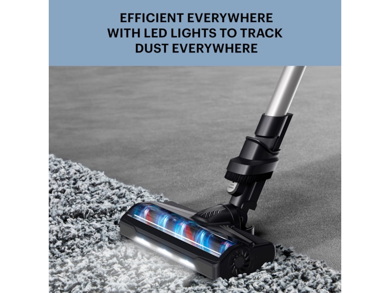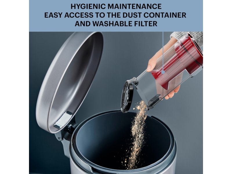 Stangstøvsugeren har en gennemsigtig støvbeholder, så du let kan se, om du suger noget op ved et uheld. Støvbeholderen har en kapacitet på 0,44 liter, og den kan let tømmes i affaldsspanden. Støvbeholderens generøse størrelse betyder, at du ikke behøver tømme den ofte. Tip – skyl beholderen, når du har tømt den, så holder den sig frisk.