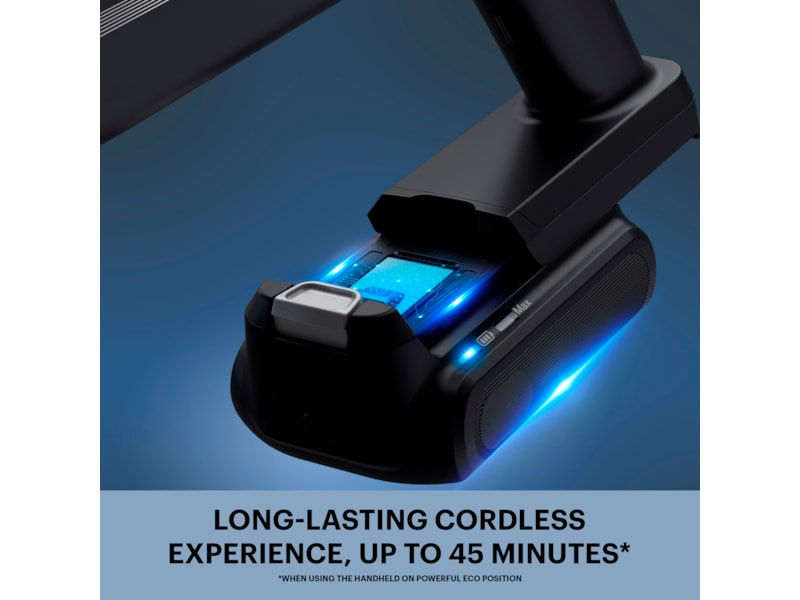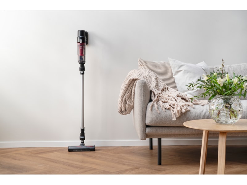 X-pert 7.60 har lang batteritid på op til 45 minutter**. For at oplade batteriet placerer du støvsugeren i opladningsstationen, der monteres på væggen. Den har også opbevaring til det medfølgende tilbehør. Vil du ikke have støvsugeren på væggen? Opbevar stangstøvsugeren i et lille skab ved hurtigt og nemt at dele den op i flere dele.