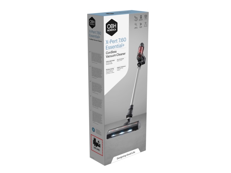 X-pert 7.60 Essential+ fra OBH Nordica er en trådløs stangstøvsuger, der er udviklet til at give perfekt balance mellem komfort og præstation. Denne stangstøvsuger leveres med en mini-turbobørste til at suge dyrehår op. Den har LED-lys, der viser skjult støv og dyrehår, som man ellers ikke ville have set. Med en håndholdt vægt på kun 1,2 kg kan du støvsuge fra gulv til loft. Lydniveauet på 81 dB gør det også behageligt for ørerne at rengøre.
