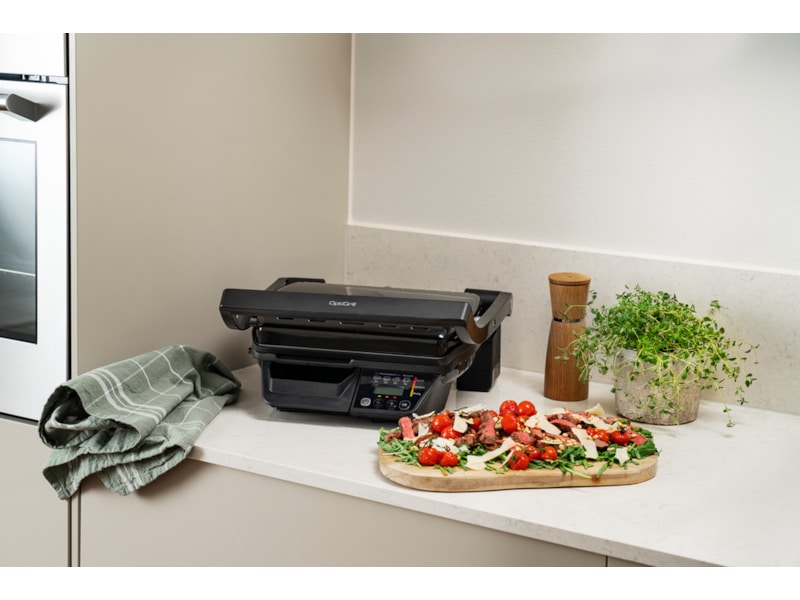 Optigrill Start giver perfekte grillresultater hver gang, fordi den er udstyret med en sensor, der automatisk registrerer tykkelsen på det, du skal tilberede, og den justerer desuden tiden og temperaturen automatisk baseret på dette. Det digitale display advarer, når grillen er klar til brug, og den bipper og viser stegegrad – fra rare til well done – så du får det perfekte resultat baseret på dine præferencer. Takket være integreret nedtælling og de tre automatiske programmer for rødt kød, hamburgere og fjerkræ samt det manuelle program, der lader dig justere temperaturen mellem 120 og 270 °C, som bruges til blandt andet grøntsager og frugt, tilbereder OptiGrill en række lækre og sunde måltider.