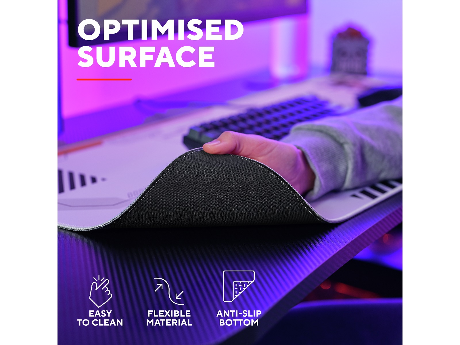 Sej og bekvemmelig, denne musemåtte kommer med syede kanter for en lille finesse og ekstra lang levetid uden frynser. Den har også en optimeret overfladestruktur designet til at give optimal nøjagtighed og jævn kontrol, så intet står i vejen for dine næste sejre.