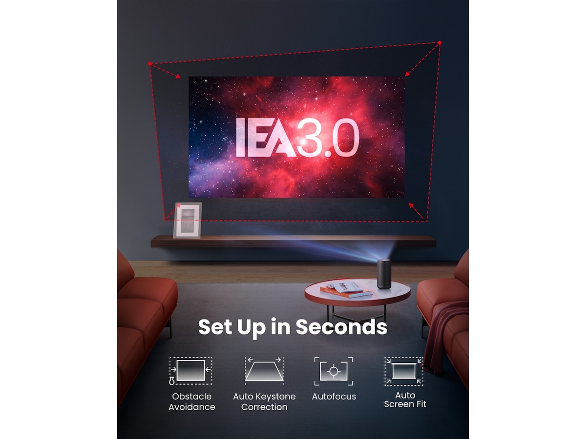 Sæt op på få sekunder: Vores intelligente miljøtilpasningsteknologi udfører automatisk keystone-korrektion, autofokus, keystone-korrektion og forhindringsundgåelse på kun 3 sekunder.