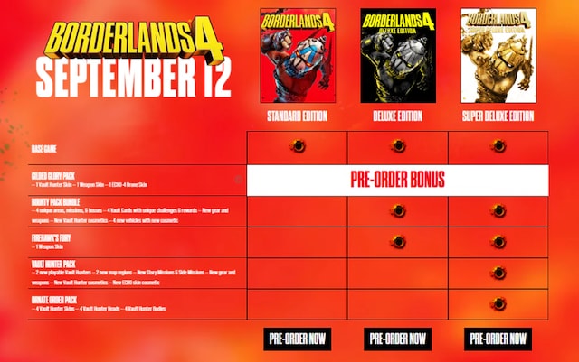 Forudbestil Borderlands 4 og modtag Gilded Glory Pack, der indeholder en Vault Hunter Skin, en Weapon Skin og en ECHO-4 Drone Skin!*