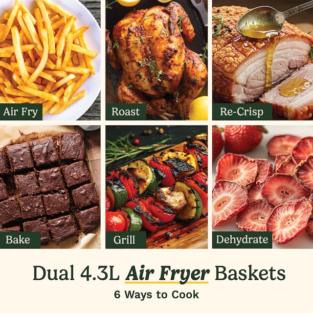 Air fry, steg, grill, bag, genopfrisk, og dehydrere i to uafhængige zoner, hvilket giver dig mulighed for at tilberede forskellige fødevarer på samme tid med skræddersyede indstillinger.