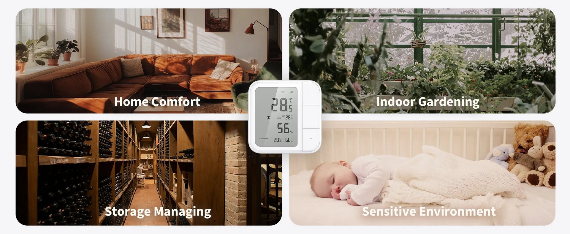 Det 3,4" store LCD-display viser realtids temperaturmålinger (±0,2°C) og luftfugtighed (±2% RH) med høj nøjagtighed. Hold dig informeret og styr hjemmets komfort effektivt, uanset om det er i soveværelset, børneværelset eller opbevaringsrummet.
