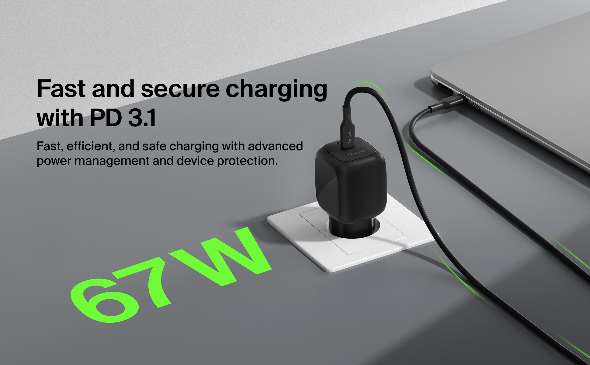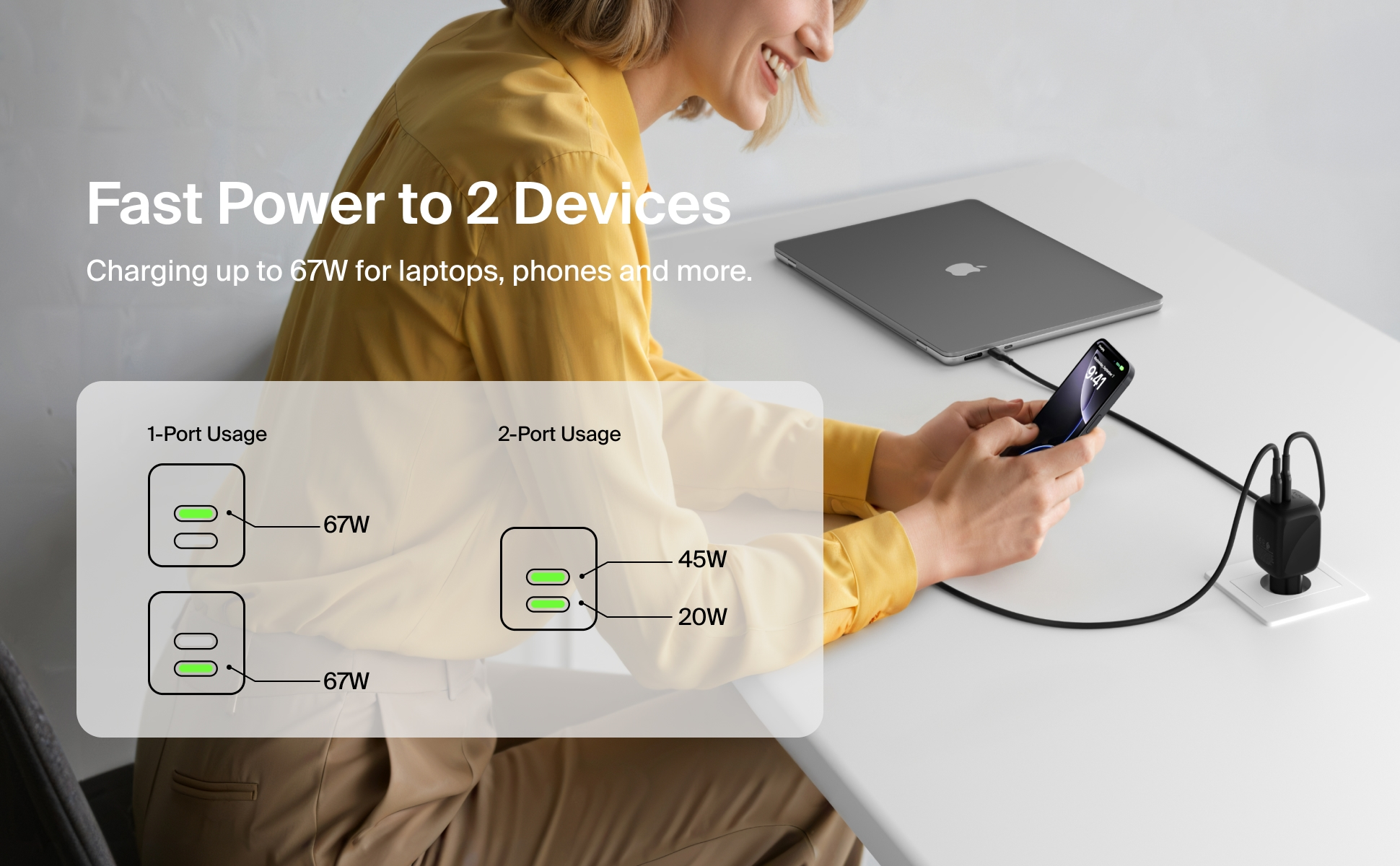 Den integrerede GaN-teknologi muliggør høj ydeevne i et kompakt format. Laderen leverer op til 67W via én USB-C-port, alternativt 45W + 20W ved samtidig brug af begge porte. Dette sikrer effektiv og hurtig opladning af flere enheder parallelt.