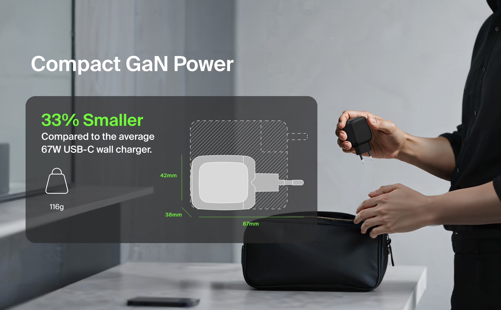 Med en vægt på kun 123 gram og dimensioner på 65 x 43 x 43 mm er BoostCharge Pro designet til optimal mobilitet og nem transport.