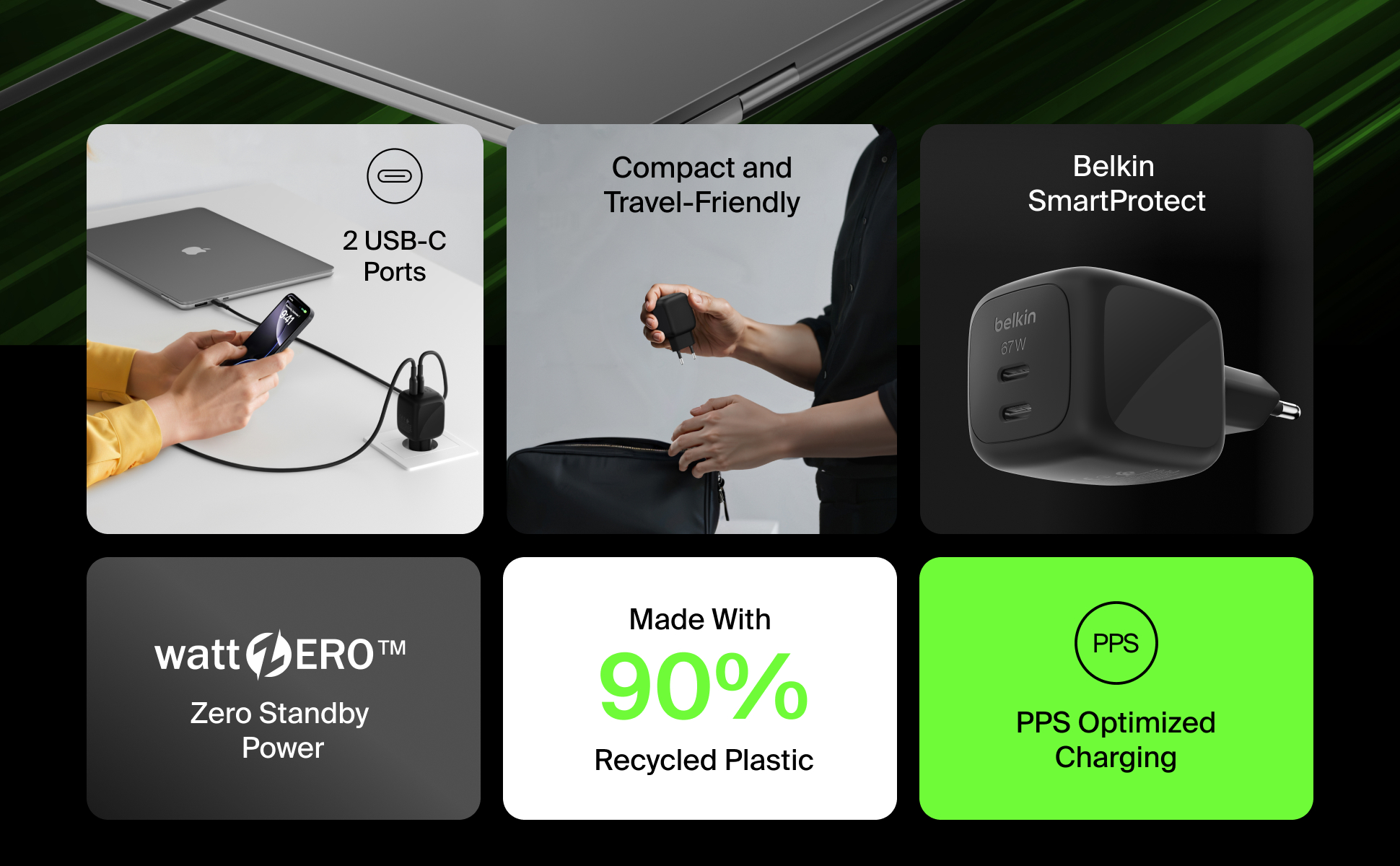 Belkin BoostCharge Pro kombinerer avanceret 67W GaN-teknologi med et kompakt design for at levere optimal ladeeffektivitet. Denne væglader er udviklet som en komplet opladningsløsning til alle dine enheder, inklusive mobiltelefon, tablet, bærbar computer, ørepropper og Smartwatch.