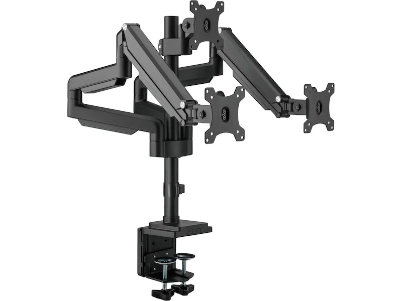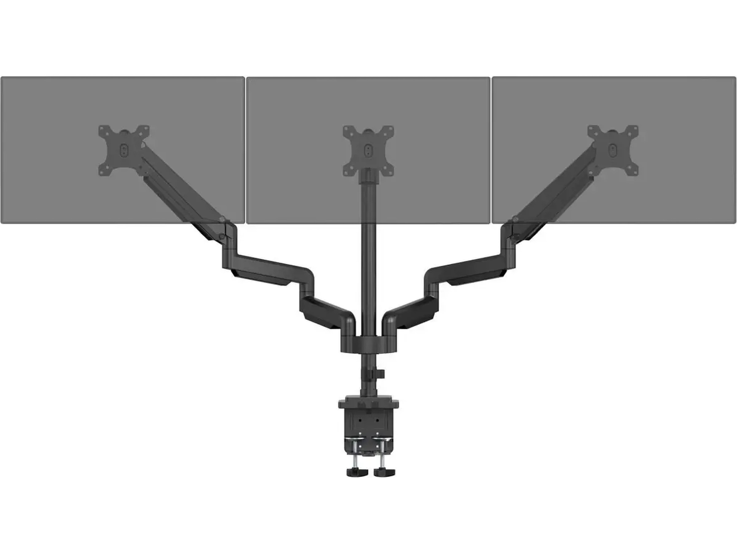 Det trearmede skærmstativ tilbyder en række justeringsmuligheder for at mindske træthed i nakke og øjne samt finde en komfortabel siddeposition. Du kan rotere hver skærm op til 90° i begge retninger, svinge hele armen 90° ud og ind, eller tilte skærmen 90° op eller ned. Uanset om du foretrækker flade eller buede skærme, passer denne arm til dig.