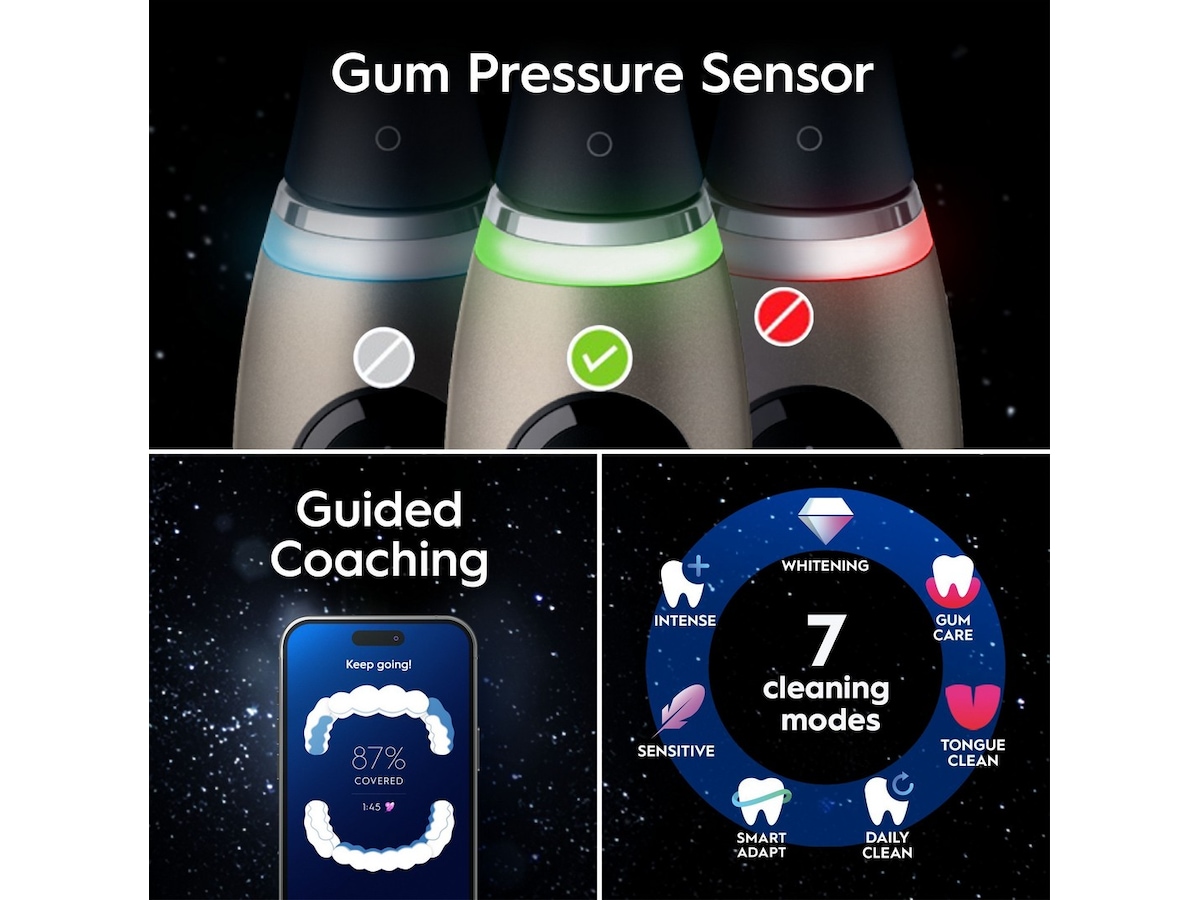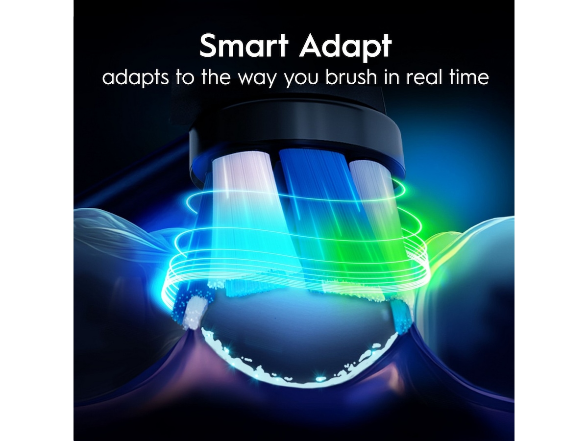 7 BØRSTEINDSTILLINGER: Smart-Adapt, daglig rengøring, sensitiv, hvidgørende, tandkødspleje, intensiv rengøring, tungebørstning