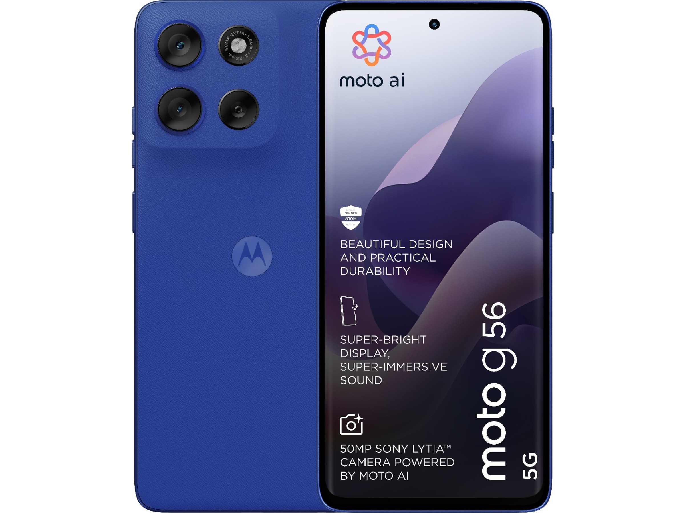 Introduktion af moto g56 5G, der kombinerer smukt design med praktisk holdbarhed. Nyd den bløde følelse af en let-at-gribe, premium finish—plus bekymringsfri beskyttelse mod vand, ekstrem temperaturmodstand og en ridsefast skærm. Forbedr din underholdning på en superlys 6.72” FHD+ skærm, understøttet af stærke stereohøjttalere med Bass Boost. Tag fremragende billeder i ethvert lys med et 50MP Sony LYTIA™ kamera drevet af moto ai. Få timers strøm på få minutter med lynhurtig TurboPower™ opladning. Frigør kraften af en octa-core processor ved 5G hastigheder. Plus, få masser af lagerplads til fotos, film, sange og apps. Den nye moto g56 5G. Holdbarhed er smukt.