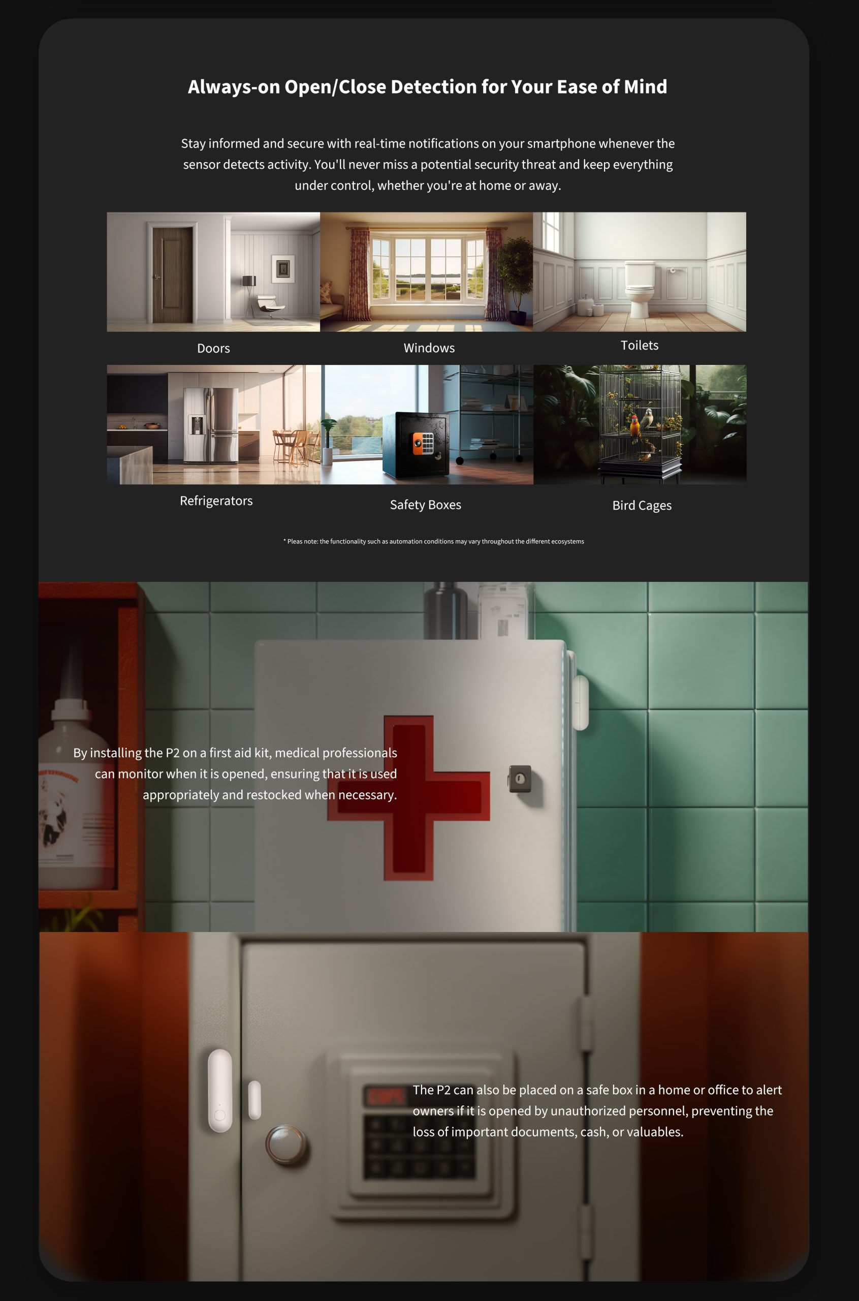 Nem installation og vedligeholdelse: Det kompakte og selvklæbende design gør P2 nem at integrere i forskellige hjemmemiljøer, og brugere kan placere den i mange forskellige situationer og steder. Takket være det kraftige CR123A**-batteri slipper brugerne for hyppige batteriskift eller vedligehold.