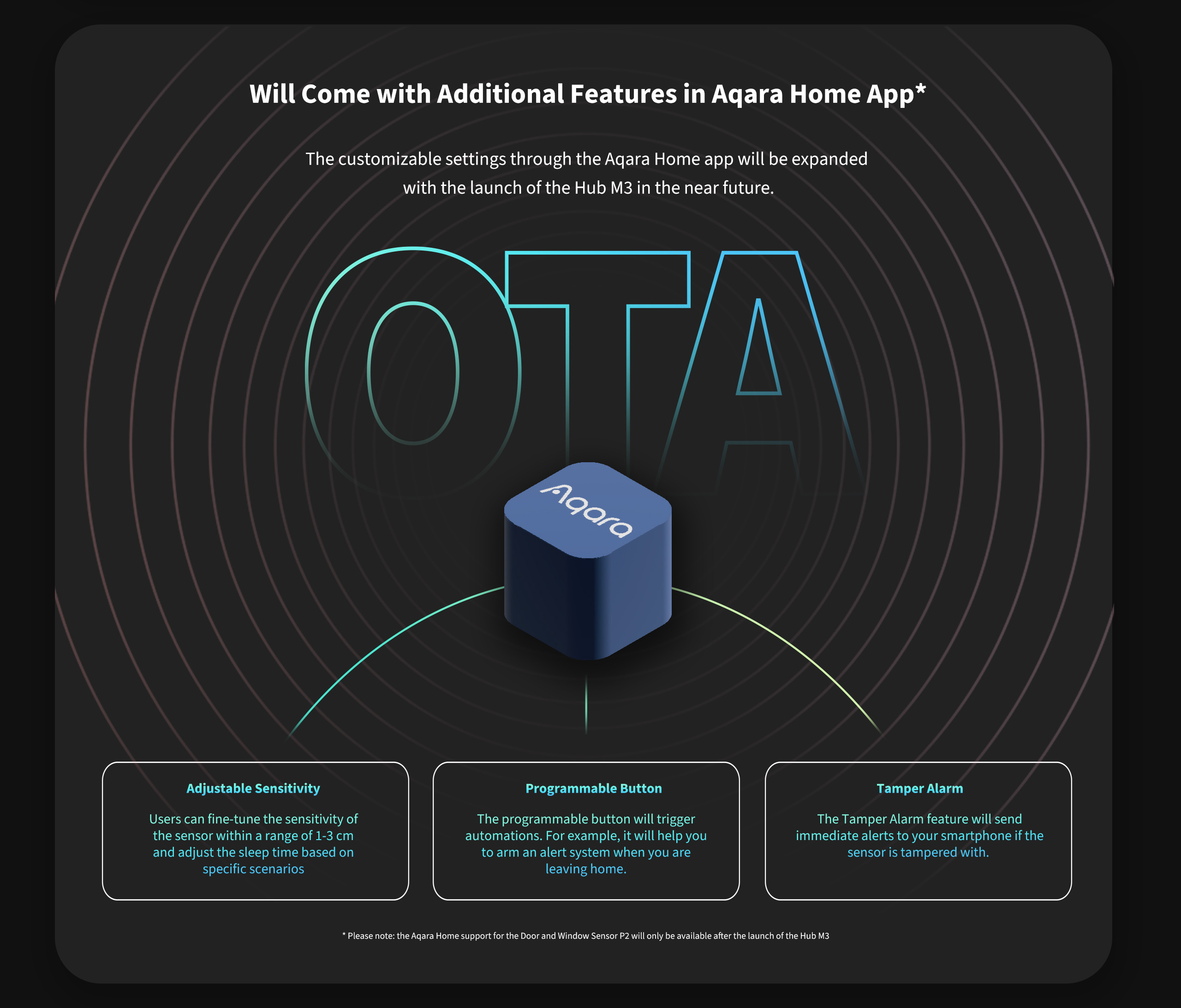 Ekstrafunktioner i Aqara Home-appen*:** De tilpassede indstillinger via Aqara Home-appen udvides med lanceringen af Hub M3 i den nærmeste fremtid. Brugere kan finjustere sensorfølsomheden i området 1–3 cm, justere hviletiden baseret på specifikke scenarier og bruge den programmerbare knap til at udløse forskellige smarthjem-automationer. Derudover vil funktionen for sabotagealarm sende øjeblikkelige notifikationer til din smartphone, hvis sensoren bliver manipuleret.